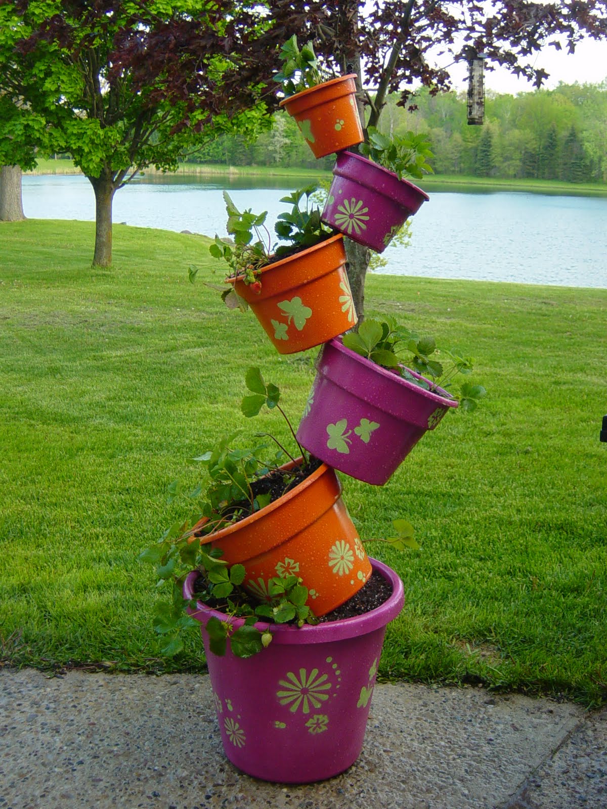 Én eléggé utálom a gumiabroncs, mint virágtartó alkalmazását, de ezen a képen, amit az interneten találtam, a fehérre alapozott és virágokkal kifestett abroncsok, szamócákkal beültetve, kimondottan tetszenek.