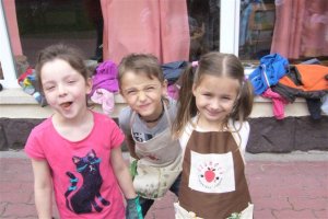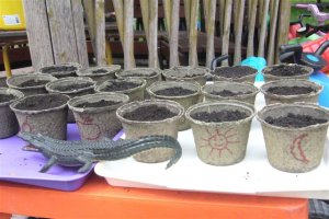 A lebomló papírcserépbe ültetett karós bab és napraforgó magok kibújtak, cserepestől a földbe kerültek. A kis kertészek tovább gondozzák a Szamócától kapott gondozási útmutató szerint.