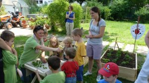 A Füvészkertben tartott bemutató foglalkozásunkon mindhárom, kánikulában nélkülözhetetlen dolog adott volt. (habár szerencsére még a nagyon nagy meleg előtt, június 15.-én tartottuk)A biokertünk magasított ágyásai egy hatalmas nyárfa szomszédságában kaptak helyet. Míg az ágyásokba beültetett paradicsomok déltől napoznak, a délelőtti foglalkozáson a kis kertészek élvezhették a nyárfa hűsítő árnyékát.