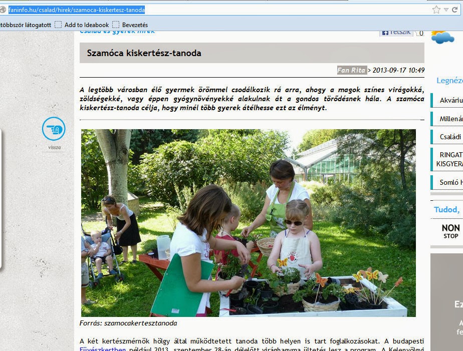 Rólunk írták a Gödi Körképben 2013. 7 szám Zsu Szamoca2013. július 24. szerdaHozzászólások (0) katt ide :Gödi Körkép 2013.7 Oldal ajánlása emailben X Címzett: Feladó: Üzenet: Ajánlott bejegyzések X 3+1 májusi kiskertész feladat - 2015-05-12 Föld napjára veteményest! - 2015-04-21 3+1 áprilisi kiskertész feladat - 2015-04-02 Kövess minket a FACEBOOK-on is Szamóca Kiskertész Hasonló bejegyzések: Rólunk írták Tökös foglalkozás a Gödi Szamóca Kiskertész Tanodában Iskola udvar rendezés a Németh László iskolában Flesőgödön 2013.04.30 Bemutató foglalkozás a Füvészkertben 2013. június 15.