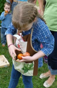 Kertész kötényeinket előrelátóan jó sok zsebbel varrattuk, de ezt a termés mennyiséget már nem tudták befogadni a zsebek, de a leleményes kis kertészek hamar megoldották ezt a problémát.
