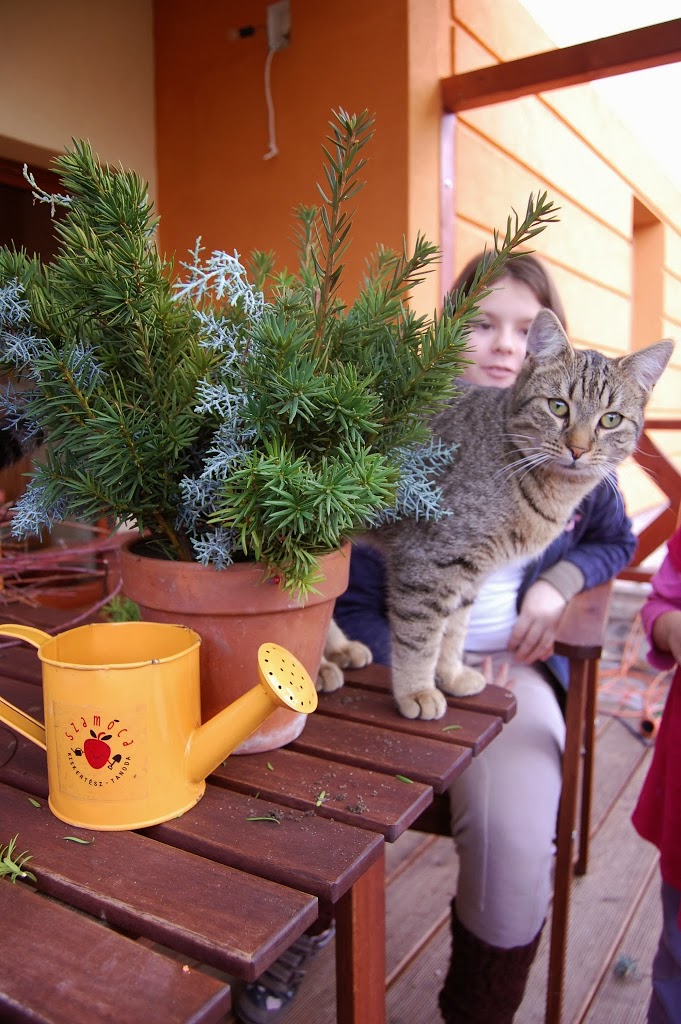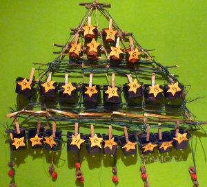 Szükség van hozzá használt cserepekre (egynyári palánta és árvácska volt ezekben), amelyik családban kis kertészek vannak, ott biztosan akad pár használt cserép is. Ágakat a kertből gyűjtöttem (tamariska, nálam kiirthatatlan), a szalagok, bogyók és színes rafia elhagyható vagy bármilyen más szalaggal helyettesíthető. A csillagok sárga papírból készültek. A cserépbe való ajándékok: mindenki saját belátása szerint. Ha nagyobb lenne gyermekem valószínű tennék bele magokat is, amit majd elvethet, de egyelőre maradok a megehető ajándéktárgyaknál.